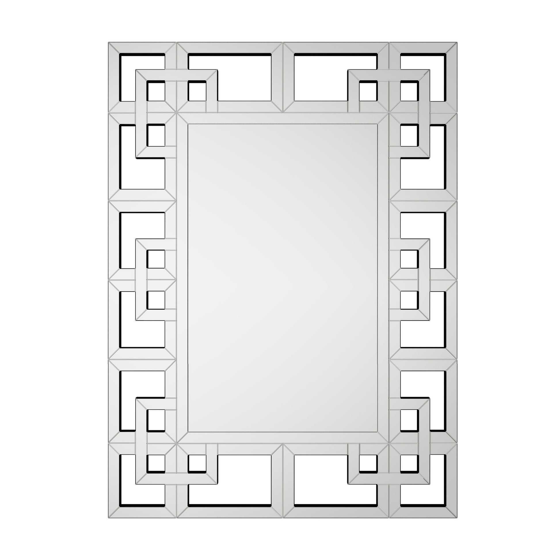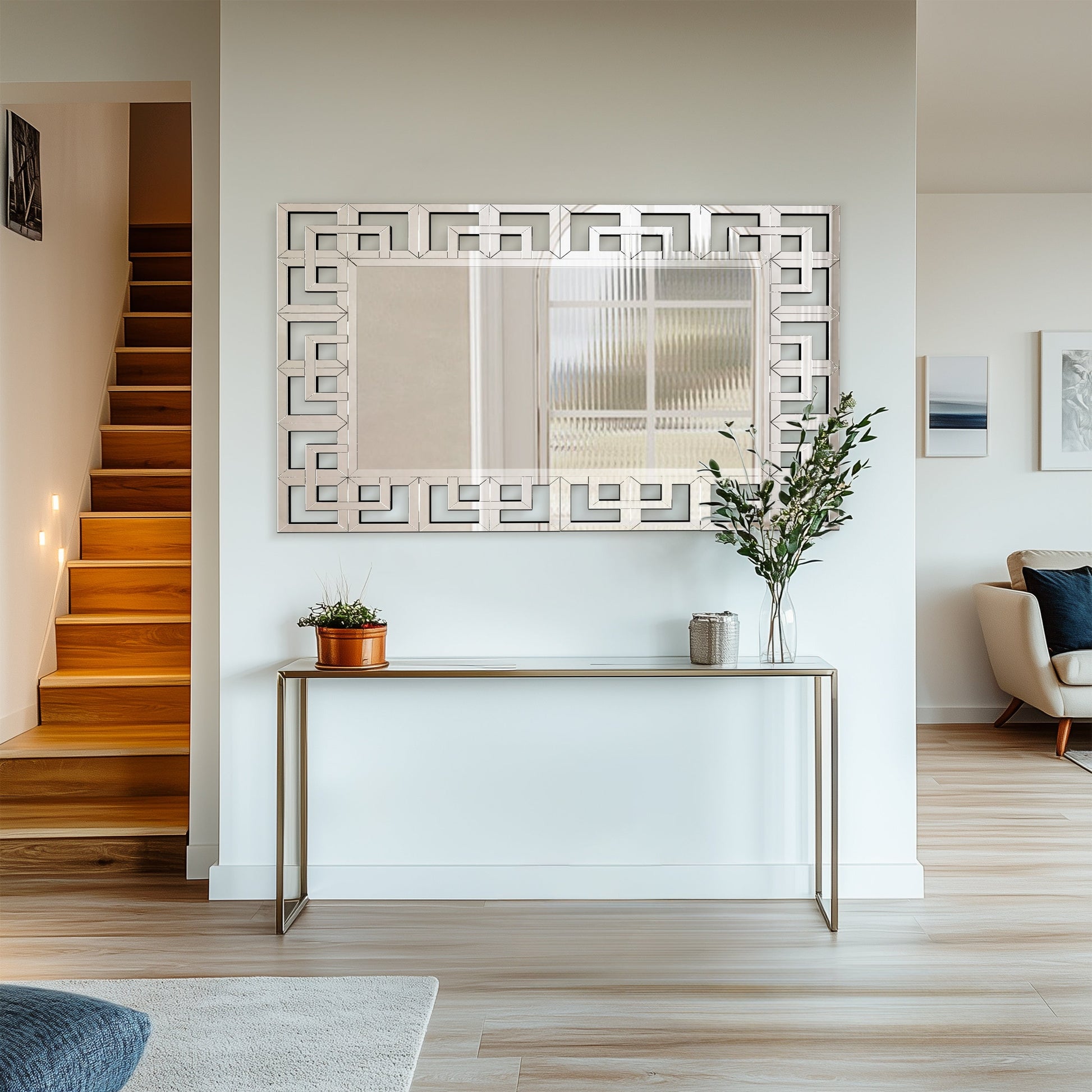 Grand miroir mural décoratif avec cadre géométrique aux accents argentés