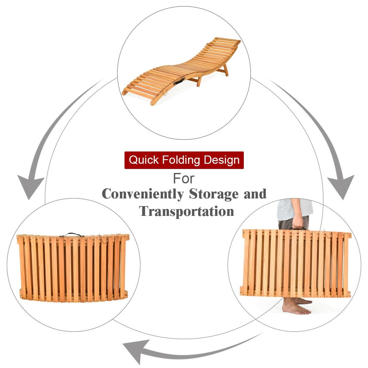 Our patio lounge chair will offer you a cozy and enjoyable experience in your outdoor space. Made of 100% eucalyptus wood, this lounge chair is Sturdy. And it can hold up to 400 lbs. This chaise features an ergonomic curve and a thick cushion, which will relax your body and make you feel comfortable. Two-sided cushion allows you to choose different colors according to your preference. There are ropes on the cushion, which is designed to prevent it from moving. Moreover, it can be folded into compact size, contributing to your easy storage and saving your space. This chair is perfect for patio, poolside, garden and other places. Take it home and enjoy your leisure time with our lounge chair!