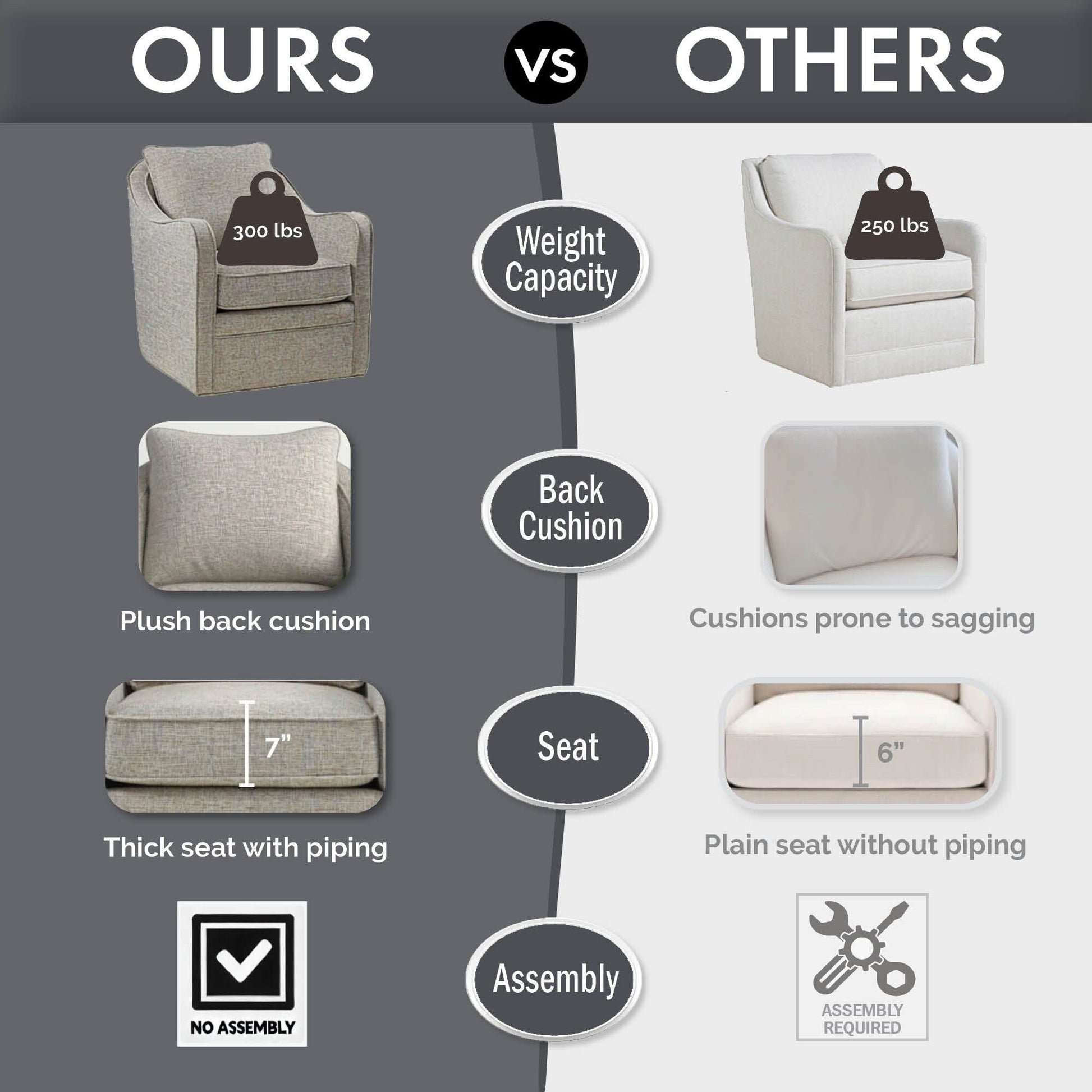 • Plywood frame with solid wood for reinforcement and a corrosion-resistant metal swivel base ensure long-lasting durability and supports up to 300 lbs