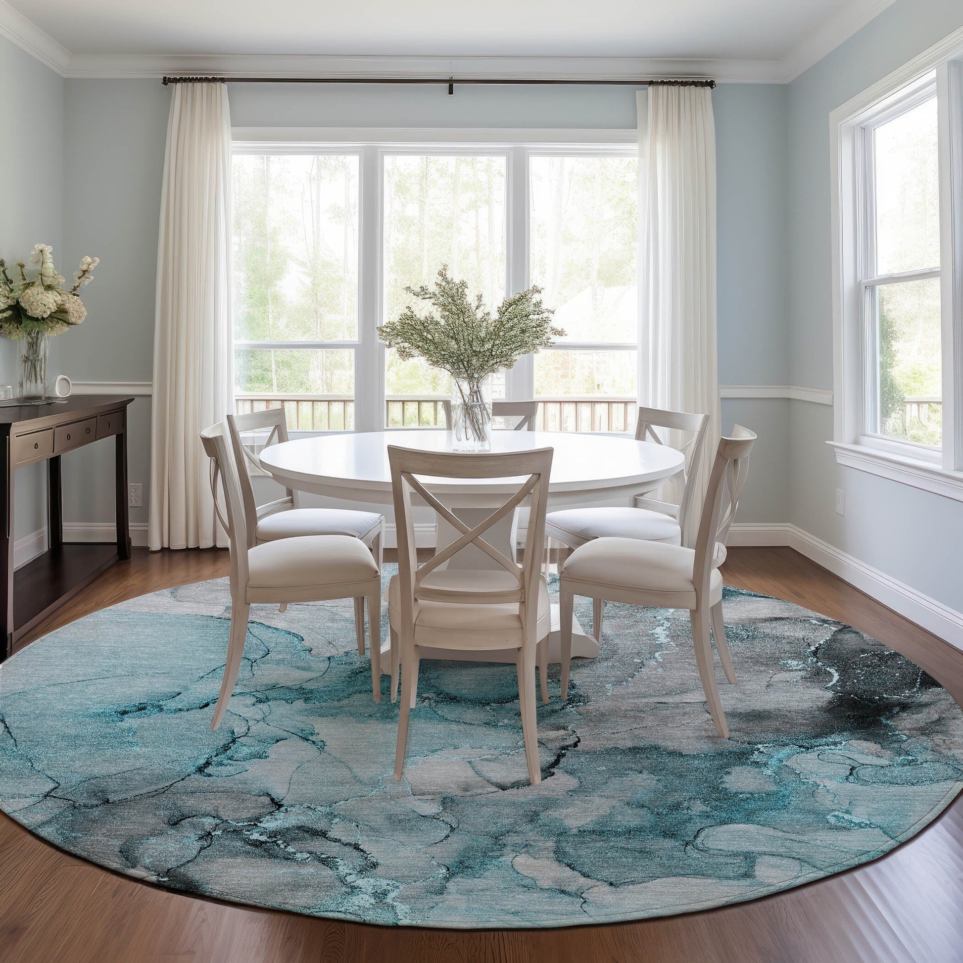 Bring home the calm with our area rug, featuring soft watercolor palettes that instill peacefulness. Its transitional watercolor design seamlessly blends with various decor styles. The rug is UV stabilized for indoor and outdoor use, and its ultra-thin design includes a non-skid backing, saving you the cost of an extra rug pad. The ultra thin profile allows for fast drying after a rainfall or outdoor cleaning. It's machine-washable, family, and pet-friendly, epitomizing practicality and style. Larger rug sizes may not fit into a residential washing machine. They may be washed in a commercial size washing machine or hosed-off outside with mild soap and water. Air-dry, do not machine dry. All rugs exposed to long periods of intense and direct sunlight can experience loss of color over time. Our rugs perform best in covered outdoor areas and uncovered areas with lower hours of direct sunlight.