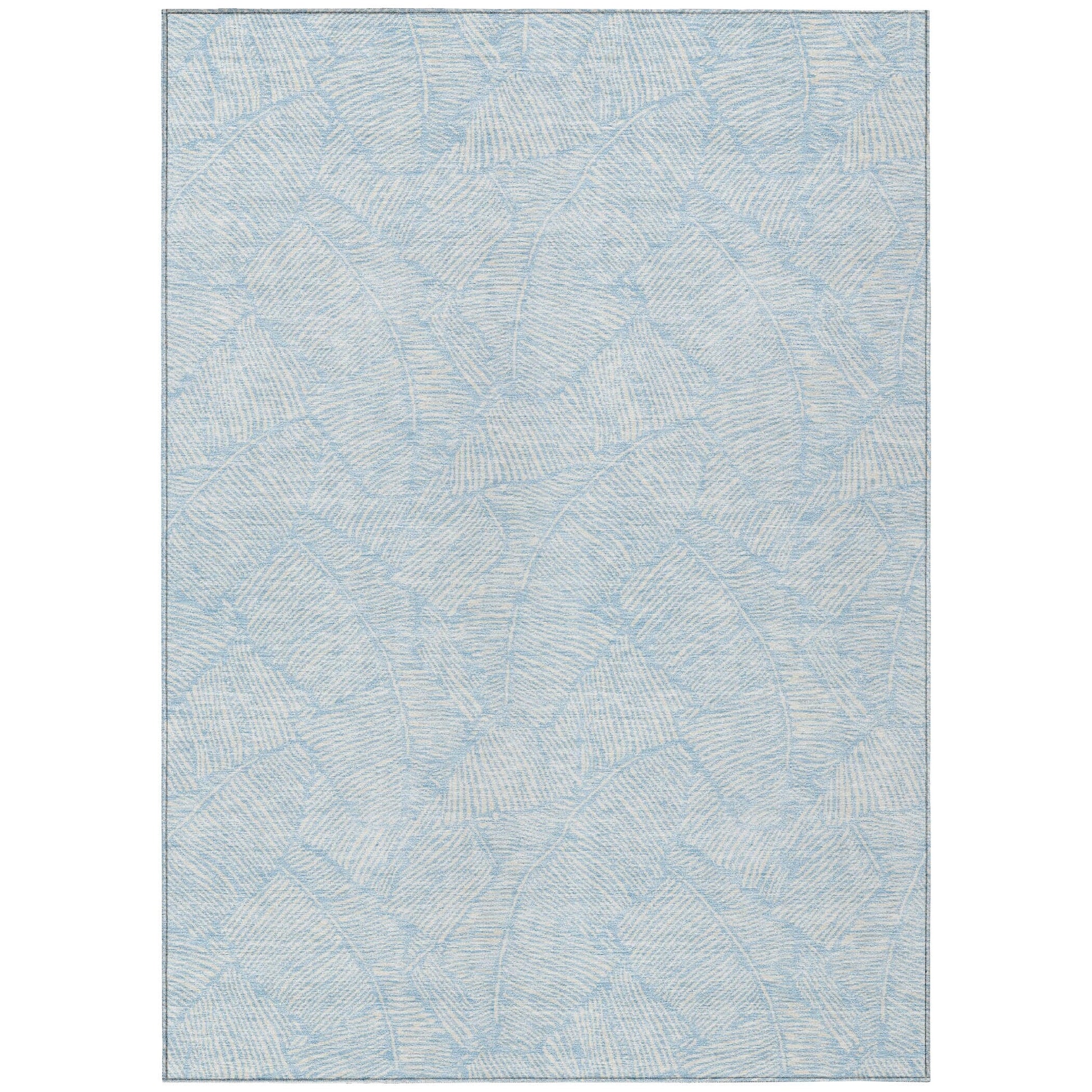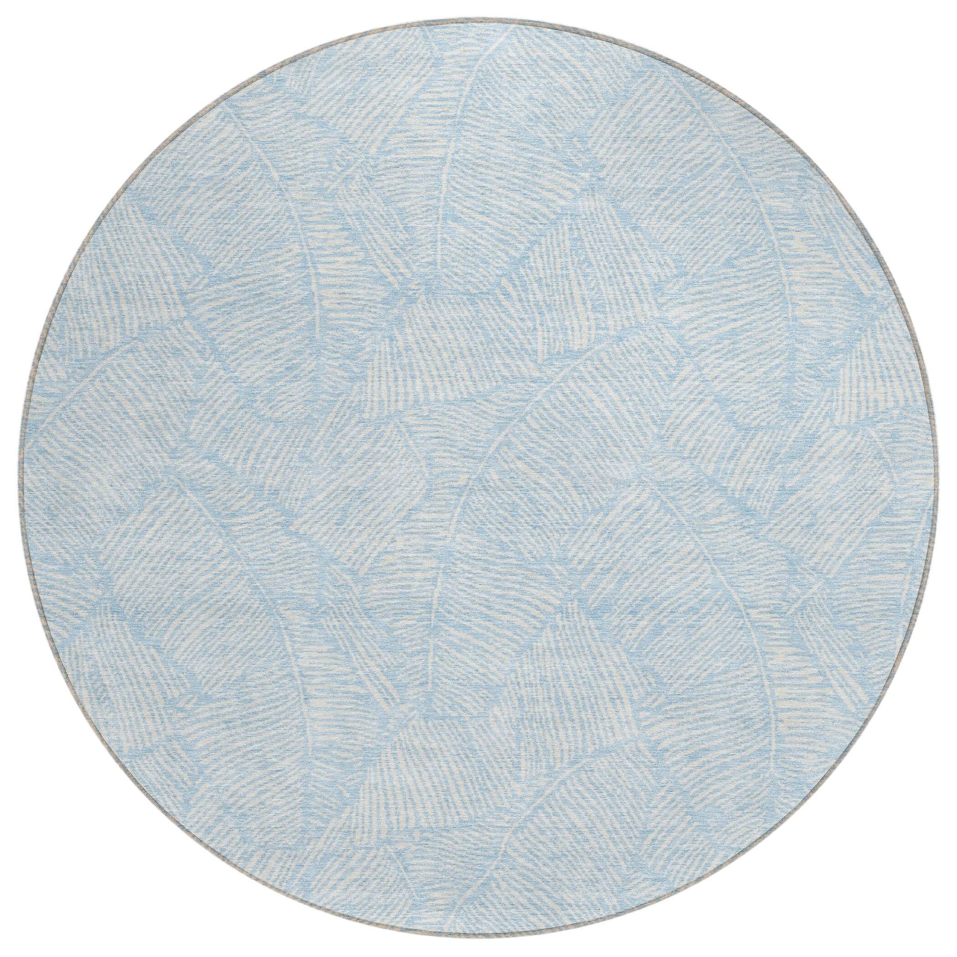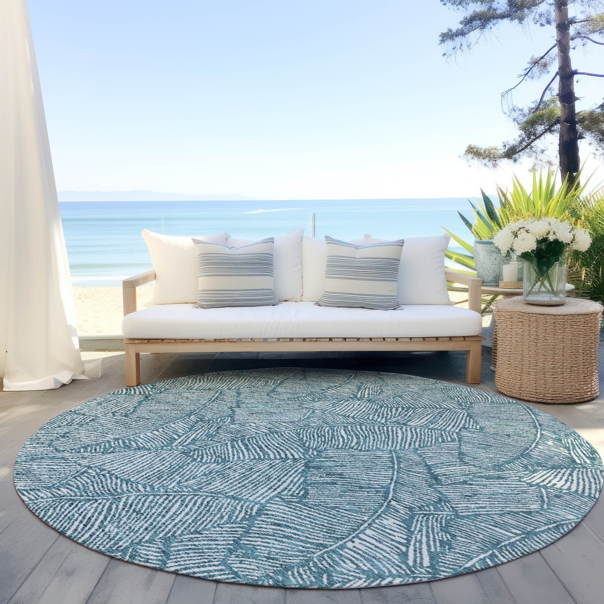 The area rug's large scaled leaves and monotone colorway provide a transitional and floral charm, perfect for enhancing any space. Its UV stabilization allows for use in any setting, while the ultra-thin build fits perfectly in your home. Machine-washable and suitable for families with pets and children, this rug offers both beauty and functionality. The ultra thin profile allows for fast drying after a rainfall or outdoor cleaning. UV Stabilized For Indoor or Outdoor Use. All rugs exposed to long periods of intense and direct sunlight can experience loss of color over time. Our rugs perform best in covered outdoor areas and uncovered areas with lower hours of direct sunlight. Larger rug sizes may not fit into a residential washing machine. They may be washed in a commercial size washing machine or hosed-off outside with mild soap and water. Air-dry, do not machine dry. While each rug already has a non-skid backing, the necessity for additional cushion or room settings with high traction areas, may require an additional rug pad.