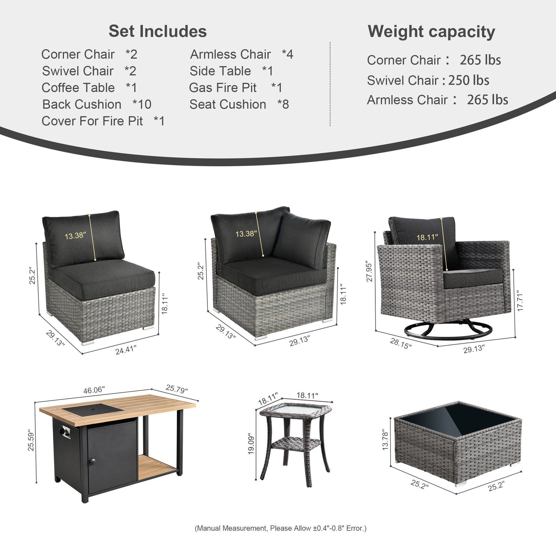 • The set includes 2 corner sofas, 4 middle sofas, 2 swivel chairs, 1 side table and a double-layer fire pit.