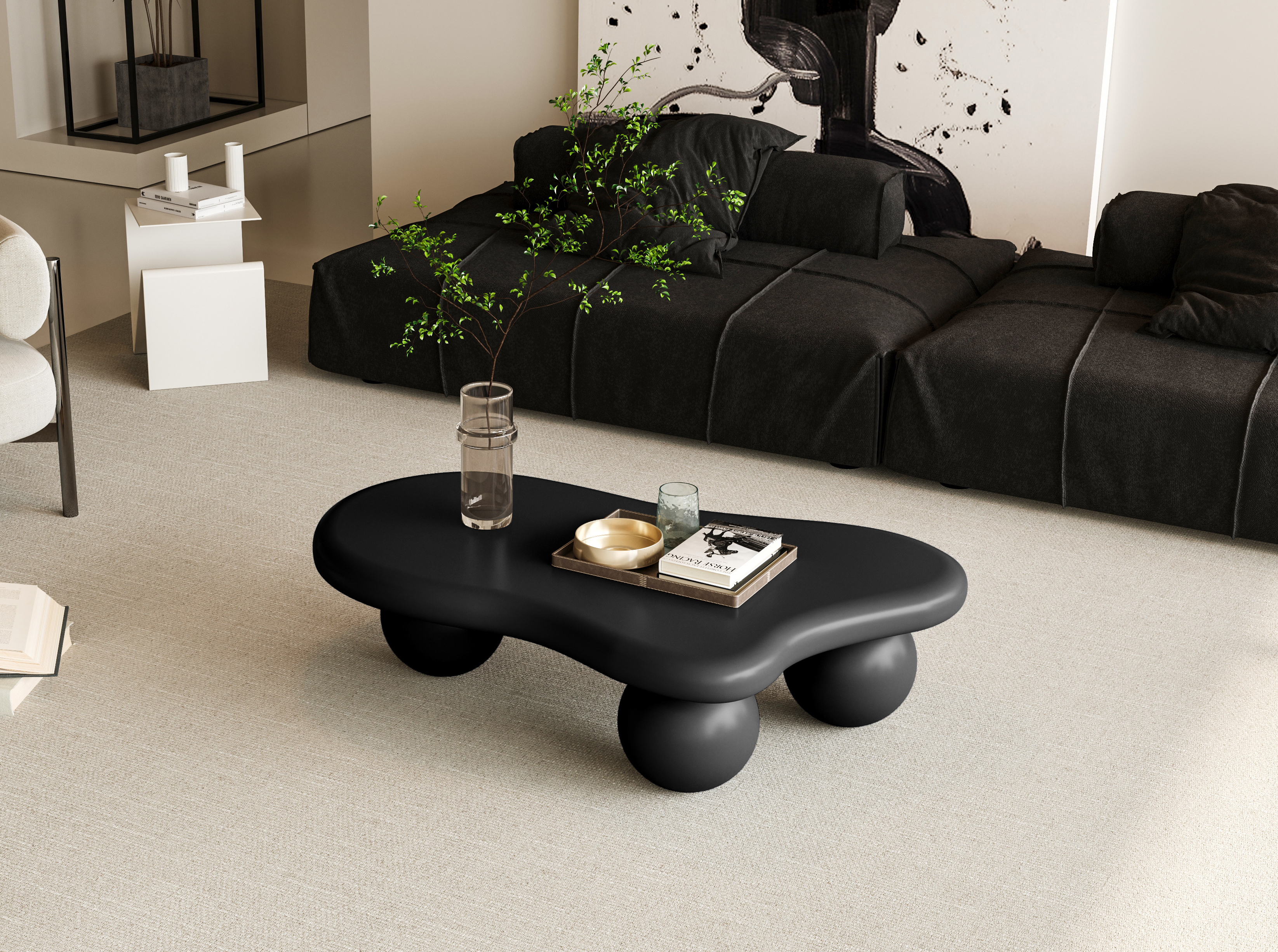 • 40 Inch Cloud Shaped Coffee Table with 3 Ball Legs for Living Room, Black