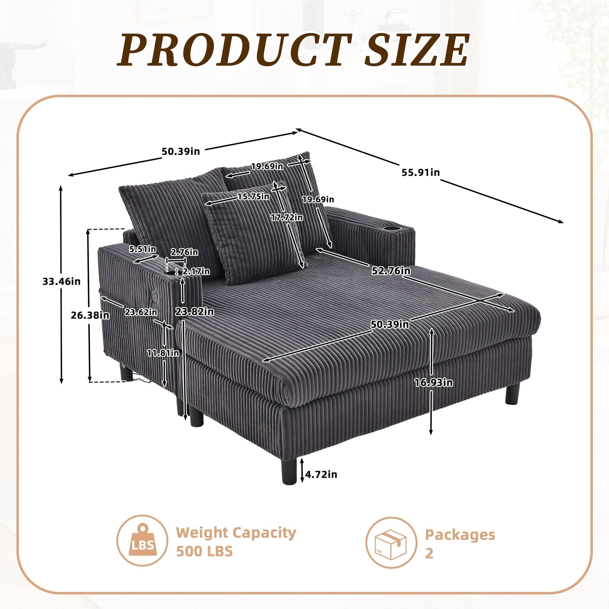 • 1*USB(5V-2.4A)+1*Type-c(5V-2.4A) Ports Type-C et USB pratiques : le canapé est doté d'un port de charge 1×USB (5V-2.4A) + 1×Type-C (5V-2.4A) intégré, qui peut être chargé à tout moment, faisant du canapé la « station d'alimentation en énergie » dans le salon, afin que vous puissiez rattraper le drame et le travail de bureau sans perdre de puissance, et profiter du confort et de la commodité en une seule étape !