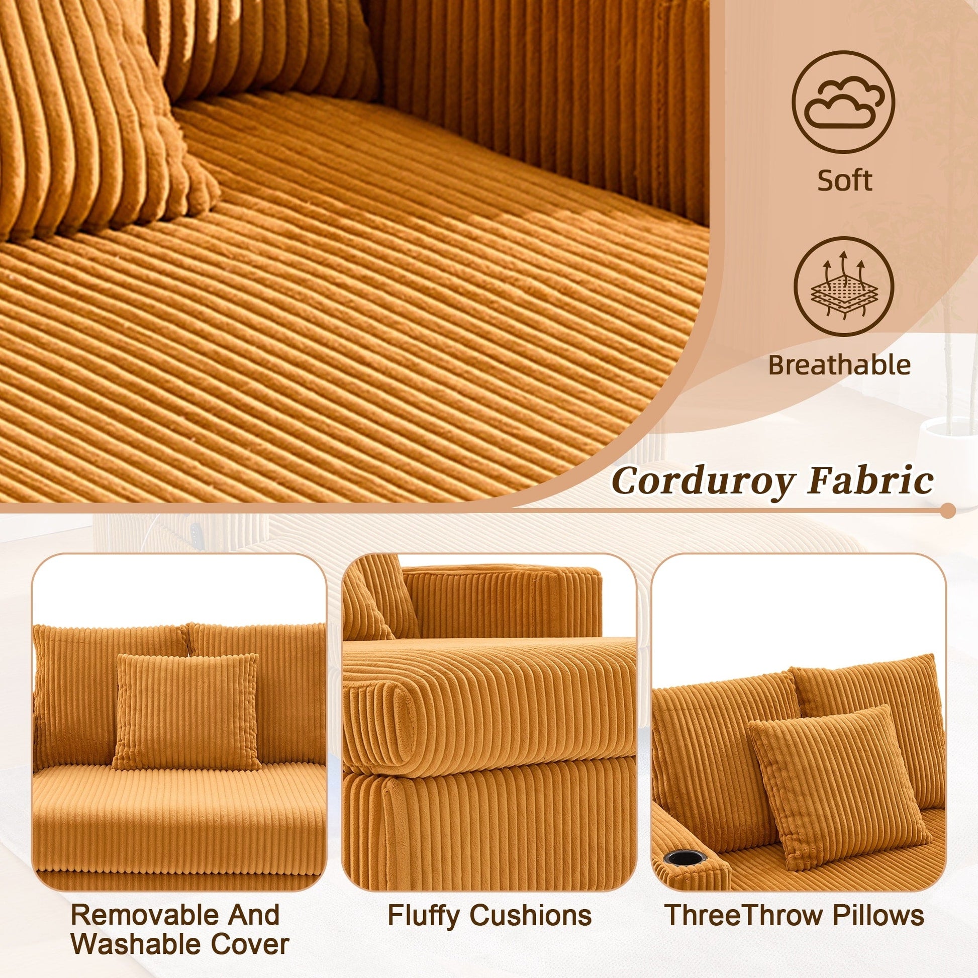 • Tissu velours côtelé, pour un confort optimal : ce produit est fabriqué en velours côtelé, doux et agréable au toucher. Son revêtement extérieur amovible et lavable permet de nettoyer facilement les taches quotidiennes et de le garder propre et pratique. Le coussin d'assise moelleux, garni d'un matériau haute résilience, offre une assise confortable et ne s'affaisse pas facilement après une utilisation prolongée. Il est livré avec trois coussins, qui peuvent être assortis aux dossiers ou utilisés en décoration, pour une expérience d'assise et de couchage optimale.