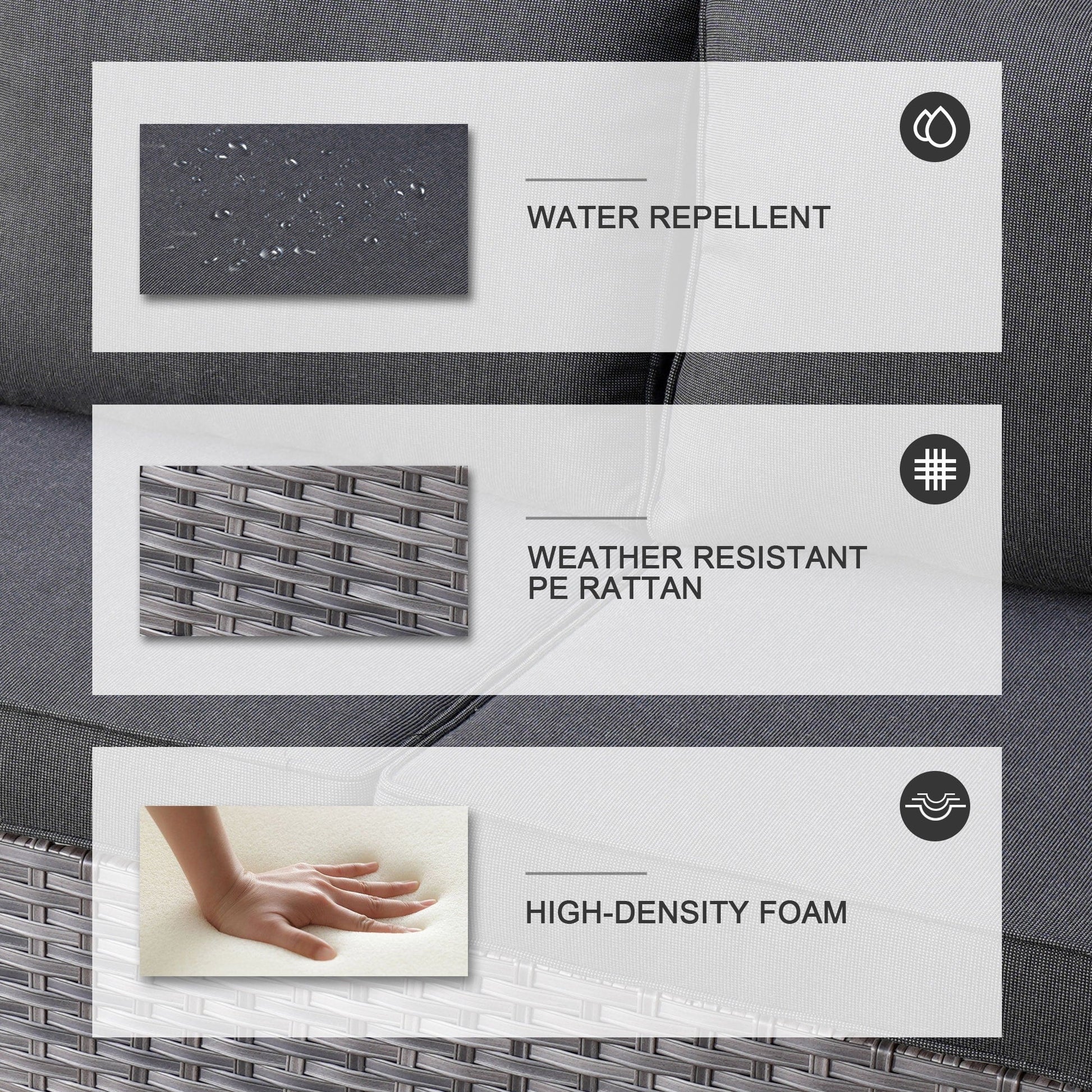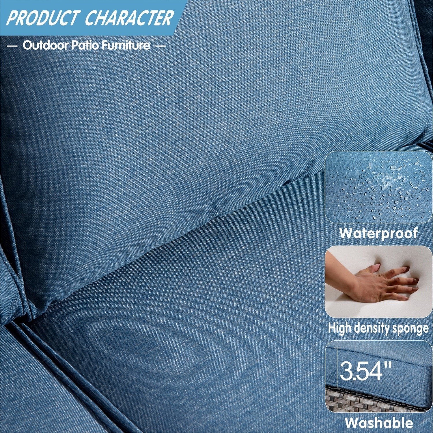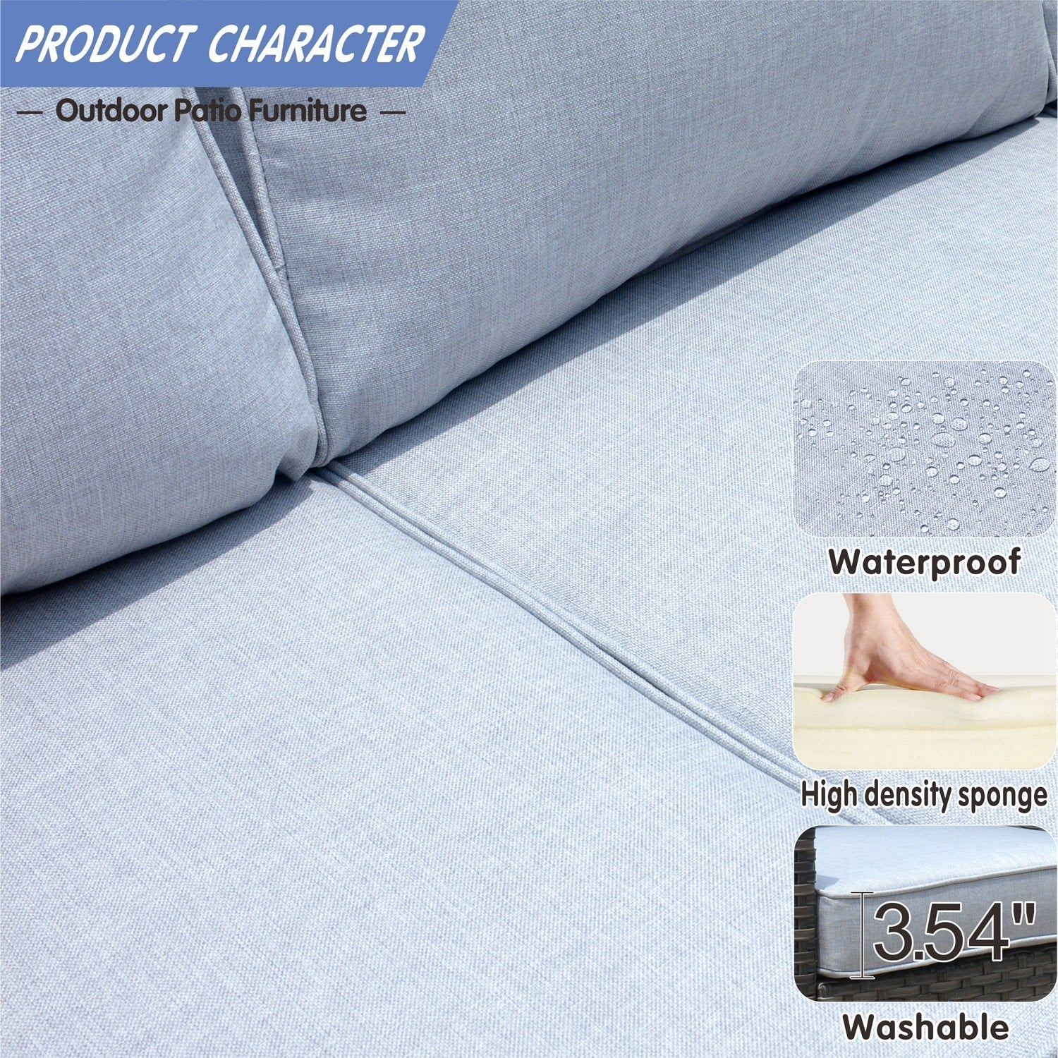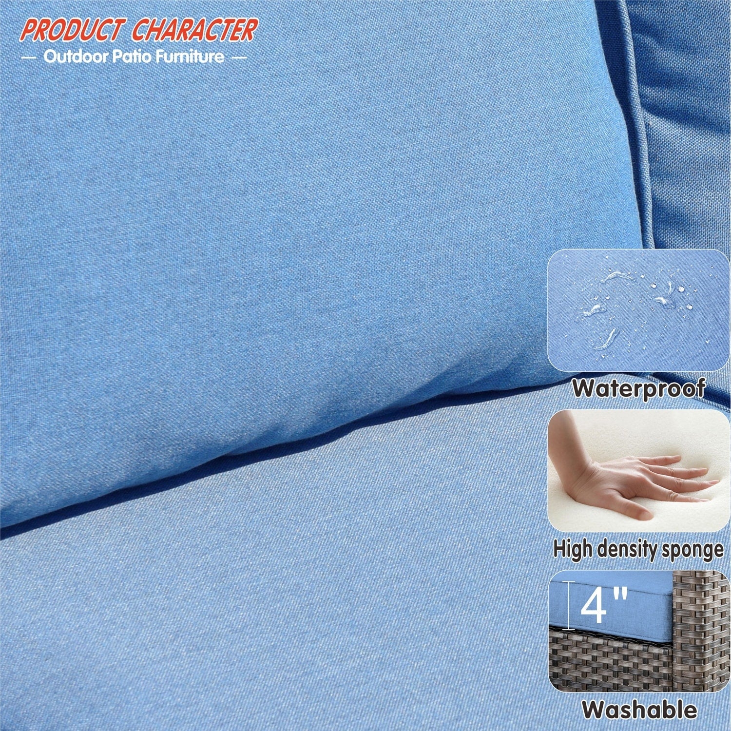 • Résistant à l'eau et aux intempéries : Les coussins et le mobilier sont conçus pour résister à l'eau, ce qui les rend parfaits pour résister à une pluie légère ou à la neige. Bien que cet ensemble résiste facilement à la plupart des conditions météorologiques, il est préférable de le protéger des intempéries extrêmes pour une meilleure longévité.