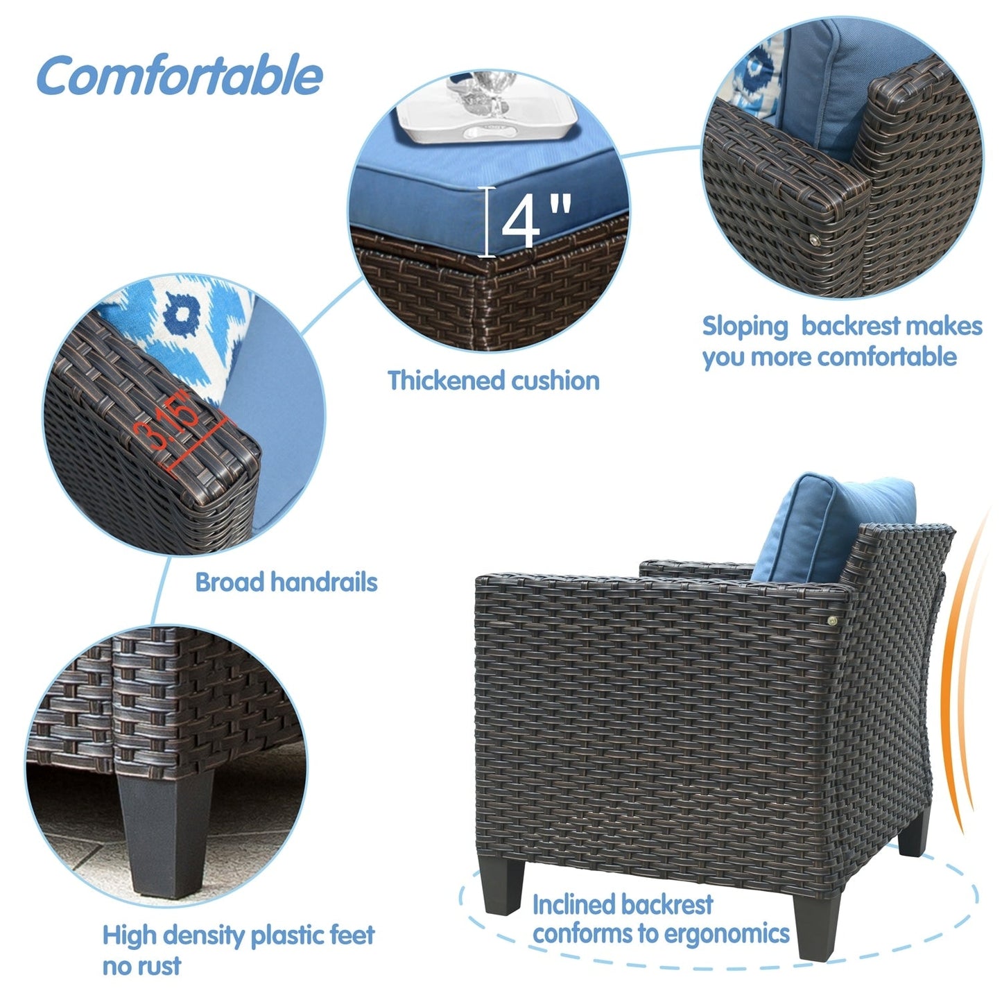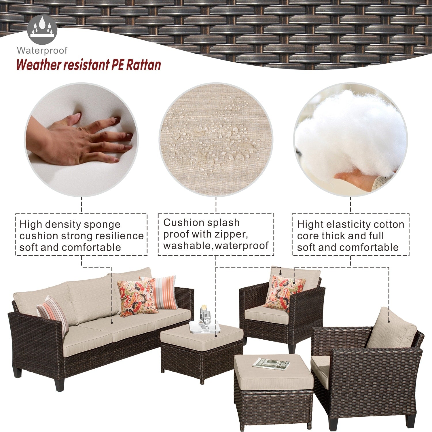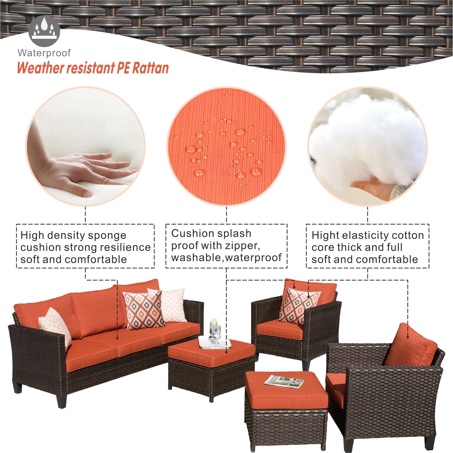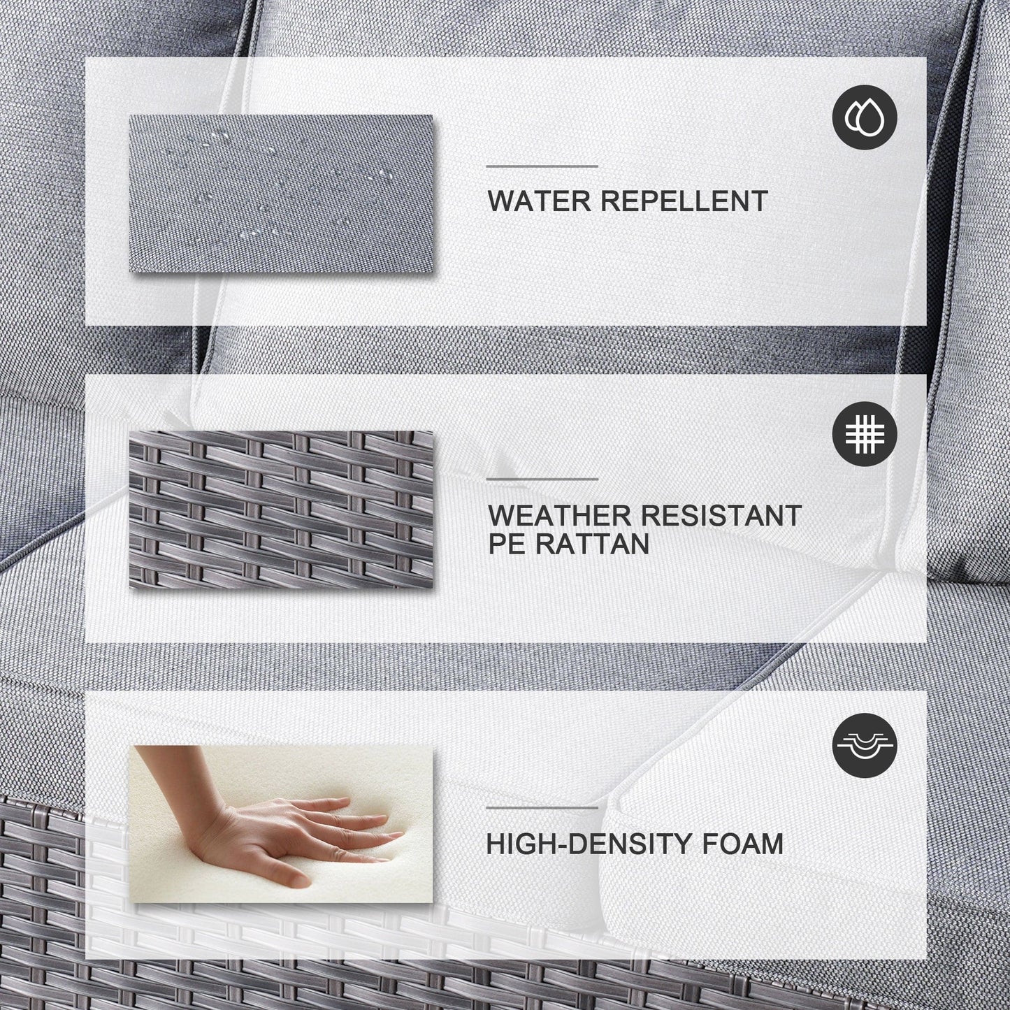 • Résistant à l'eau et aux intempéries : Les coussins et le mobilier sont conçus pour résister à l'eau, ce qui les rend parfaits pour résister à une pluie légère ou à la neige. Bien que cet ensemble résiste facilement à la plupart des conditions météorologiques, il est préférable de le protéger des intempéries extrêmes pour une meilleure longévité.